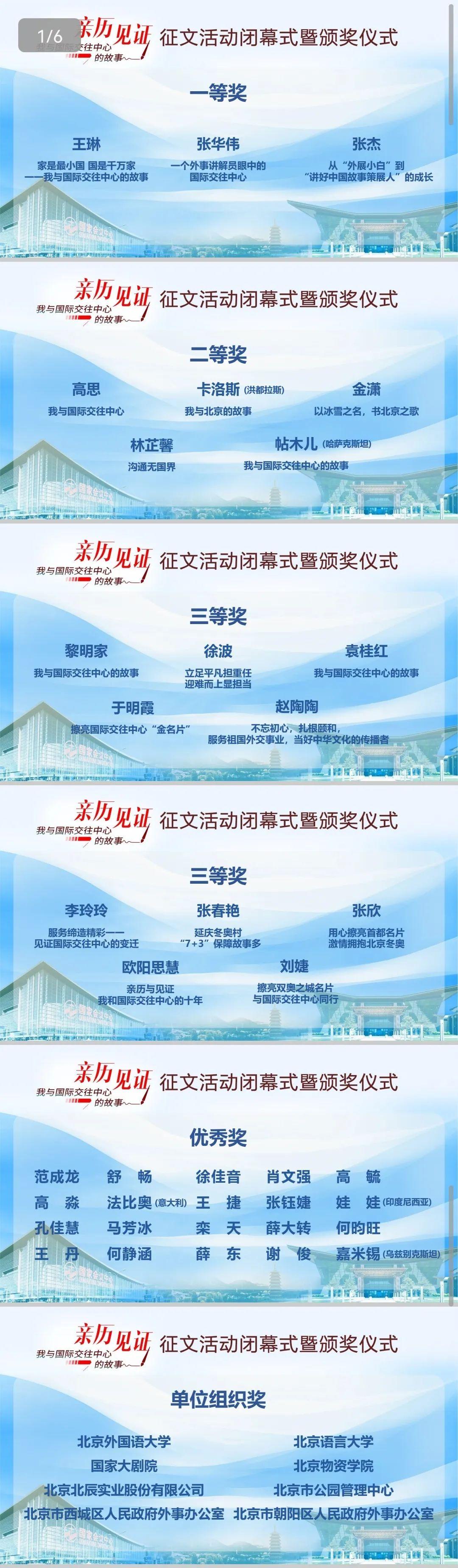 “亲历 见证———我与国际交往中心的故事”征文活动面向国际交往中心功能建设的相关建设者、服务保障人员、在京国际组织工作人员、志愿者等群体,突出以小切口展现大主题,从亲历者的视角出发,通过一个个真实的“小故事”反映北京推进国际交往中心功能建设取得的“大变化”。公司职工积极从自身参与的国际交往中心重要场馆设施建设、重大国务政务活动服务保障角度书写工作故事,共投稿征文作品10余篇,其中4篇征文获奖,国家会议中心王琳获得一等奖,五洲·会议中心李玲玲、于明霞,国家会议中心欧阳思慧分别获得三等奖。